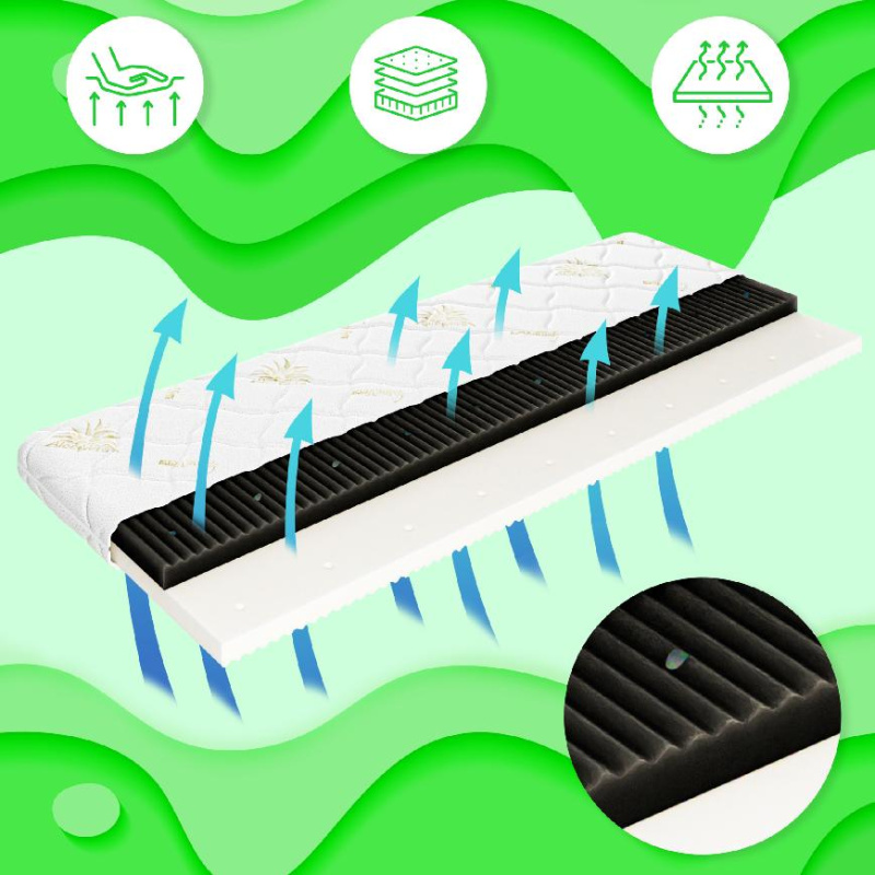 Profilované pěny poskytují vynikající rozložení hmotnosti a zmírňují tlak na citlivé části těla, což přispívá k pohodlí a zdravému vývoji páteře. Potah Aloe Vera je jemný a hypoalergenní, díky čemuž je vhodný pro děti s citlivou pokožkou. Aloe Vera má také zklidňující účinky, což podporuje příjemný spánek a ochranu před bakteriemi a mikroorganismy.