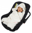 Součástí je praktická kapuce, která chrání hlavičku dítěte před chladem a větrem, a precizně umístěné otvory pro 5bodový bezpečnostní pás, umožňující snadné a bezpečné připoutání bez složité manipulace. Deka je univerzální – vhodná pro většinu autosedaček typu vajíčko, dětských nosítek a kočárků.